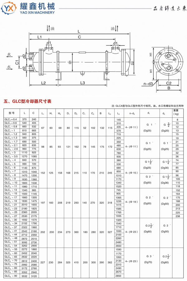 注:1.GLC-A新型高效油冷卻器在相同工況下,換熱系數(shù)K值比GLC型提高15%.